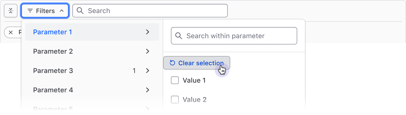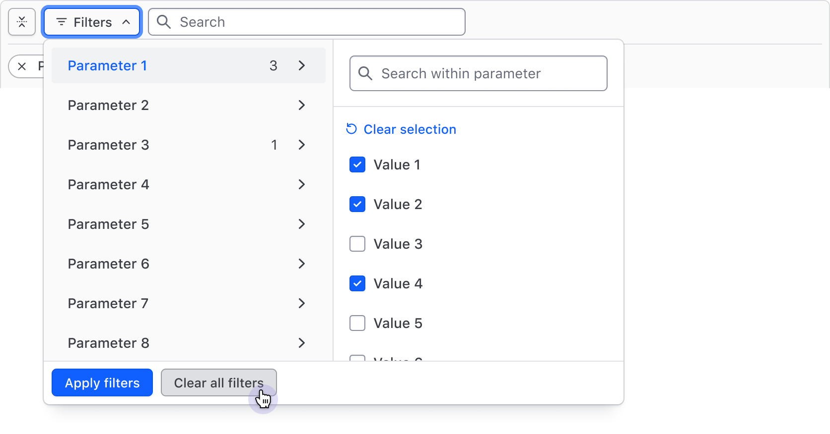Deselect all filter values within a parameter with the "Clear selection" Button, then confirm the changes with the "Apply filters" Button in the footer.