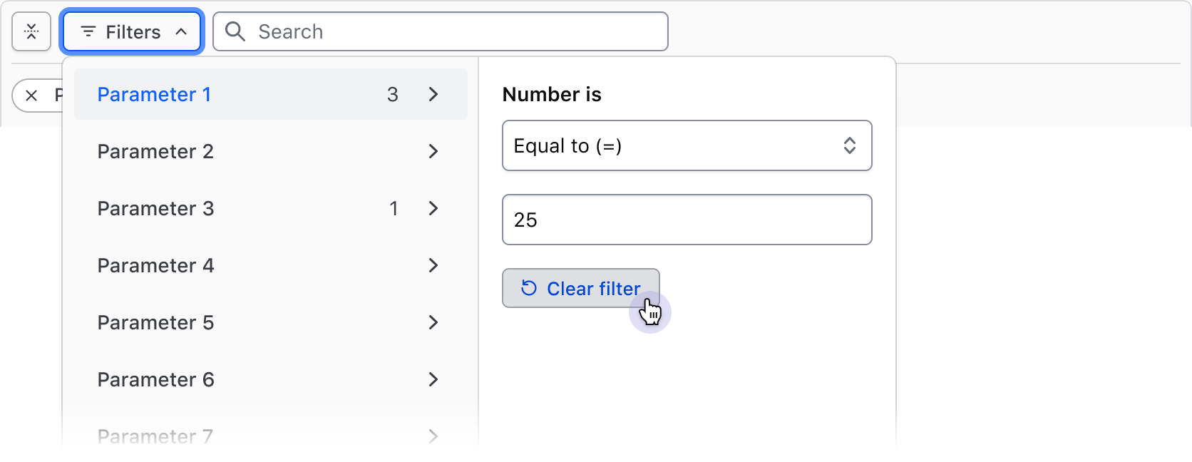 The Filter Bar supports expanding and collapsing the applied filters section to help simplify the UI around the data set and bring focus to the data or content. This is especially helpful when many filters are applied or the data set is very complex.