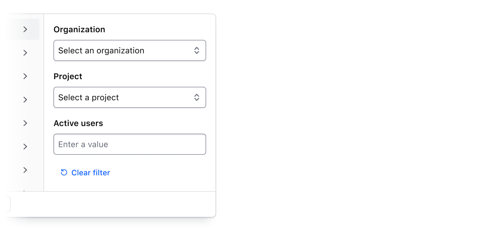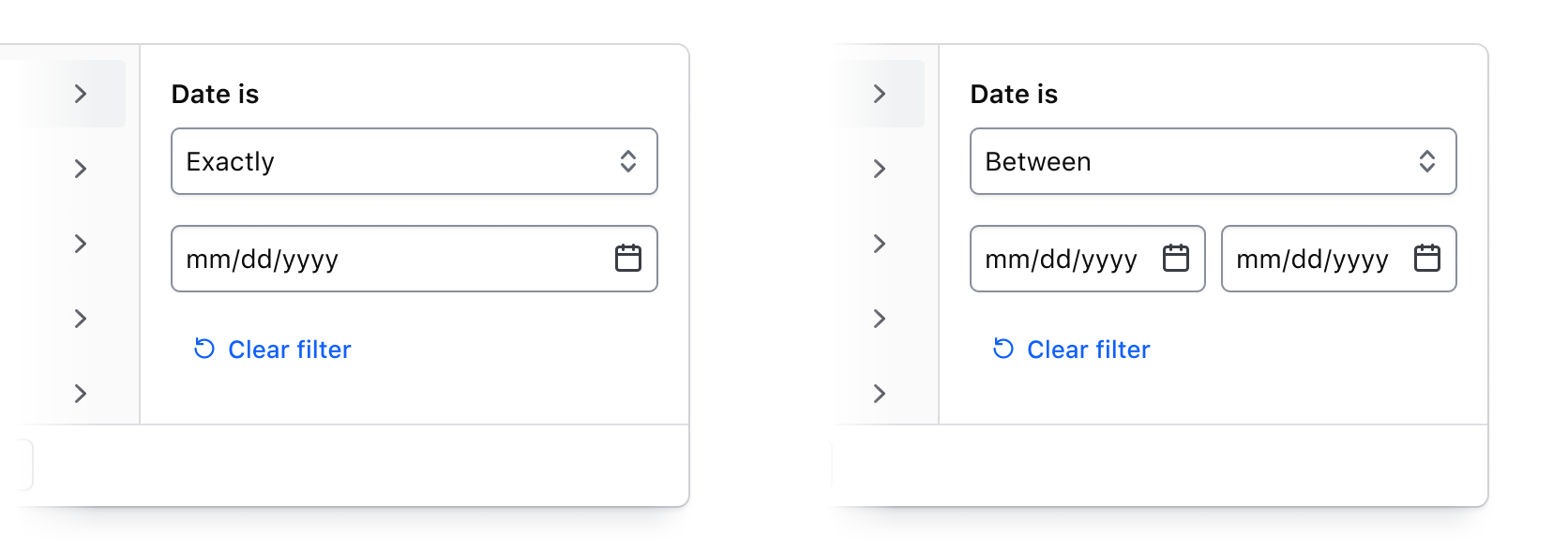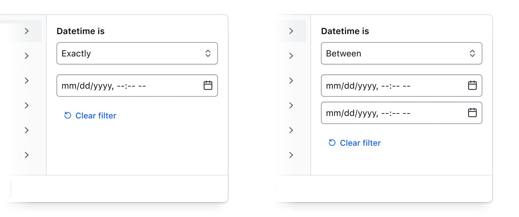 • The right panel conditionally displays either a list of options, or a grouping of input fields when filtering by a numerical, date, or time value.