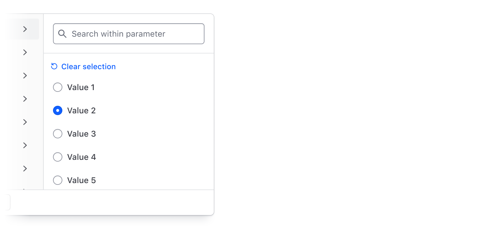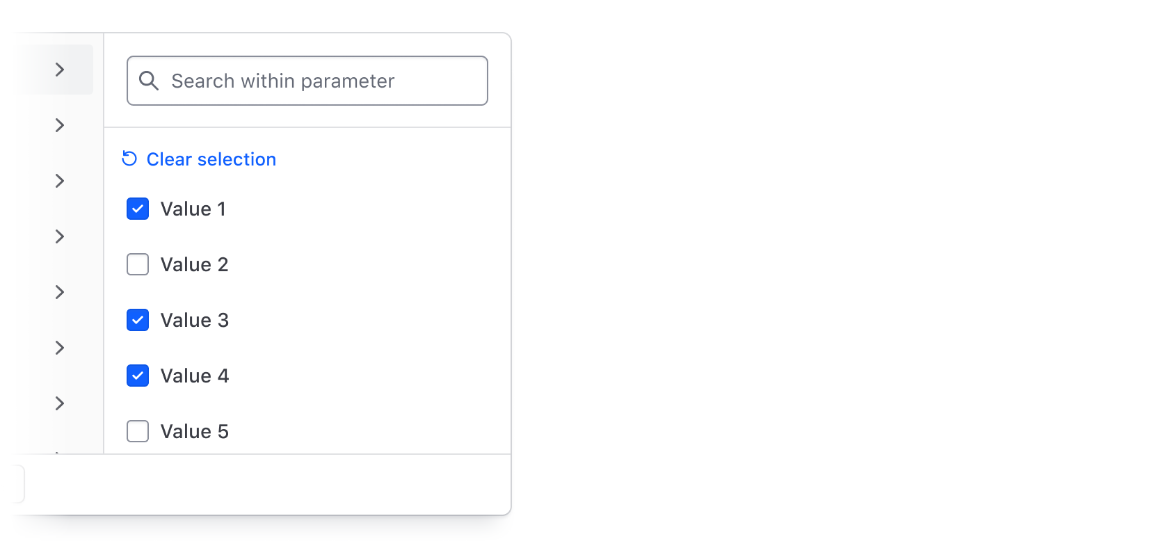 Use the integrated search (hasSearch) in the values panel to allow users to search by string across all values within a selected parameter. While only relevant for single/multi selection, search can be useful if there are many filter values or if a unique naming convention is used to artificially group results together.