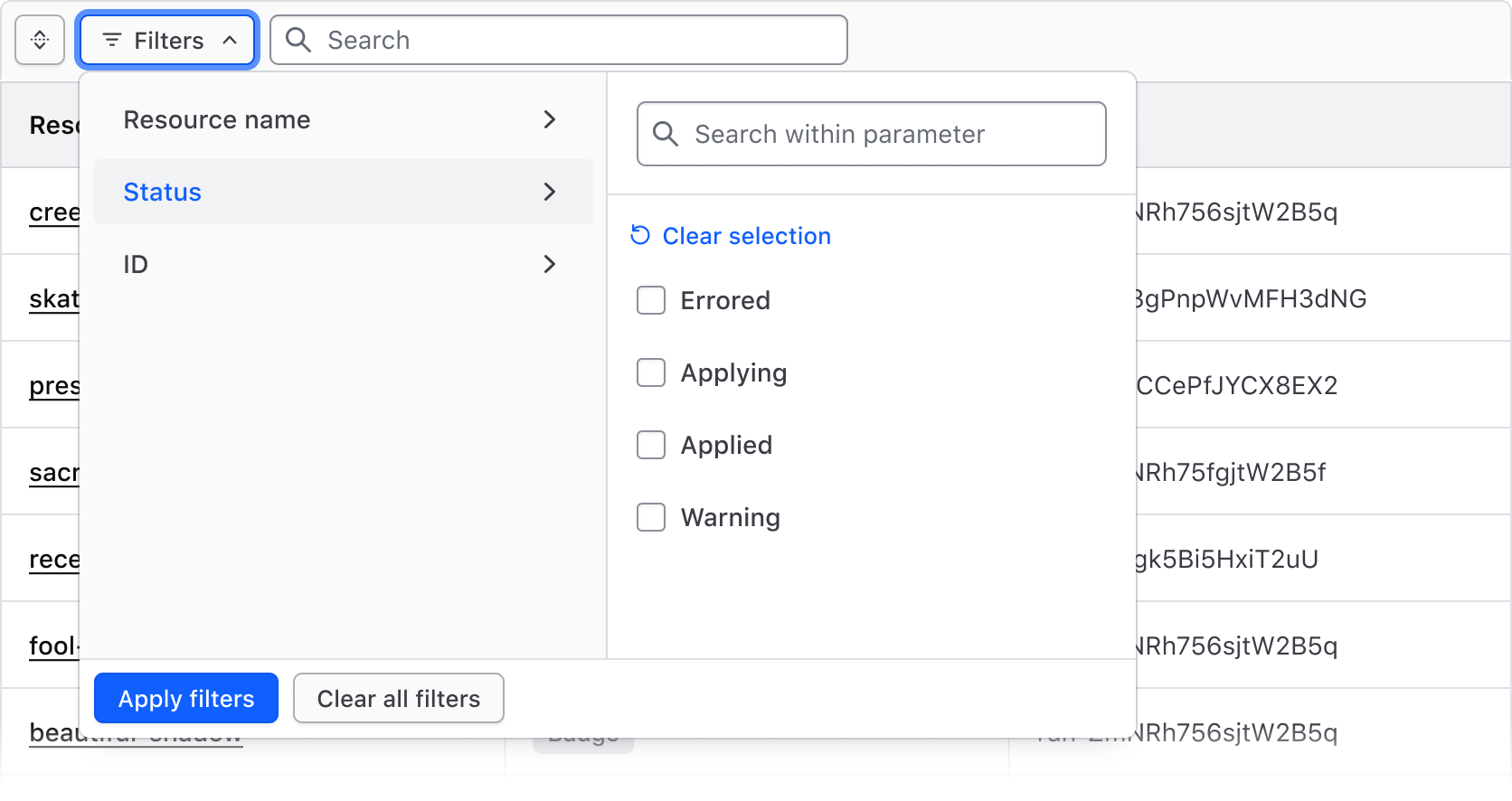 The Filter Bar component is a successor to the Filter patterns guidance and supports the vast majority of filtering experiences within HashiCorp applications out of the box. New experiences should use the Filter Bar by default instead of the adhering to the pattern guidance, while already delivered features should consider migrating to the Filter Bar component.